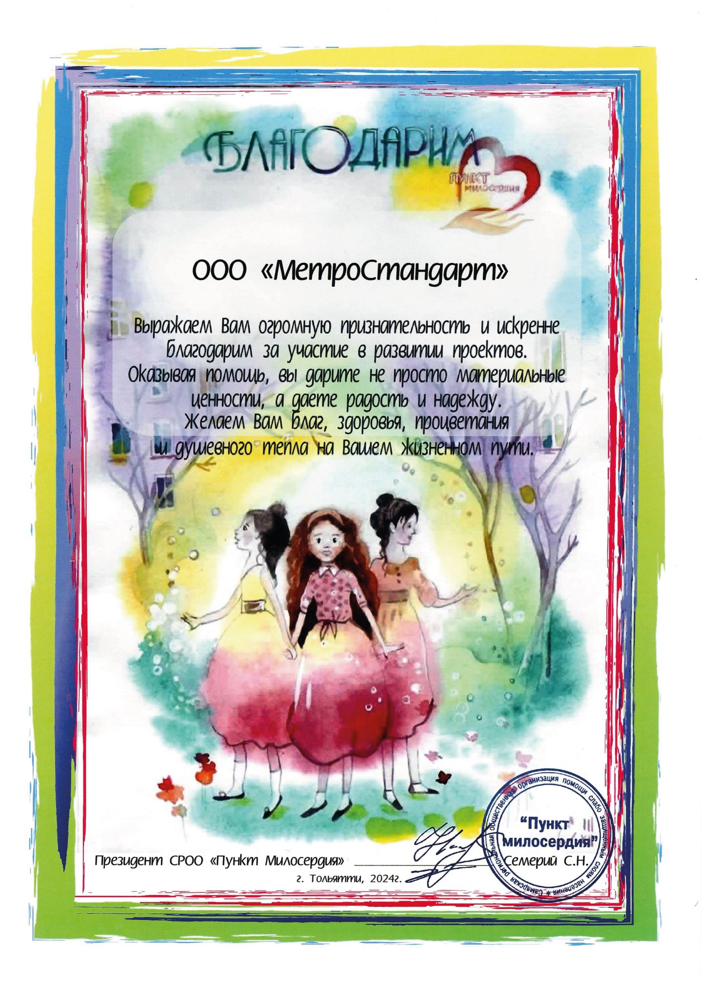 Компания "МетроСтандарт" получила благодарственное письмо от СРОО "Пункт Милосердия" за активное участие в развитии социальных проектов. Мы признательны за такую высокую оценку нашей работы и рады, что можем вносить вклад в поддержку и помощь нуждающимся.