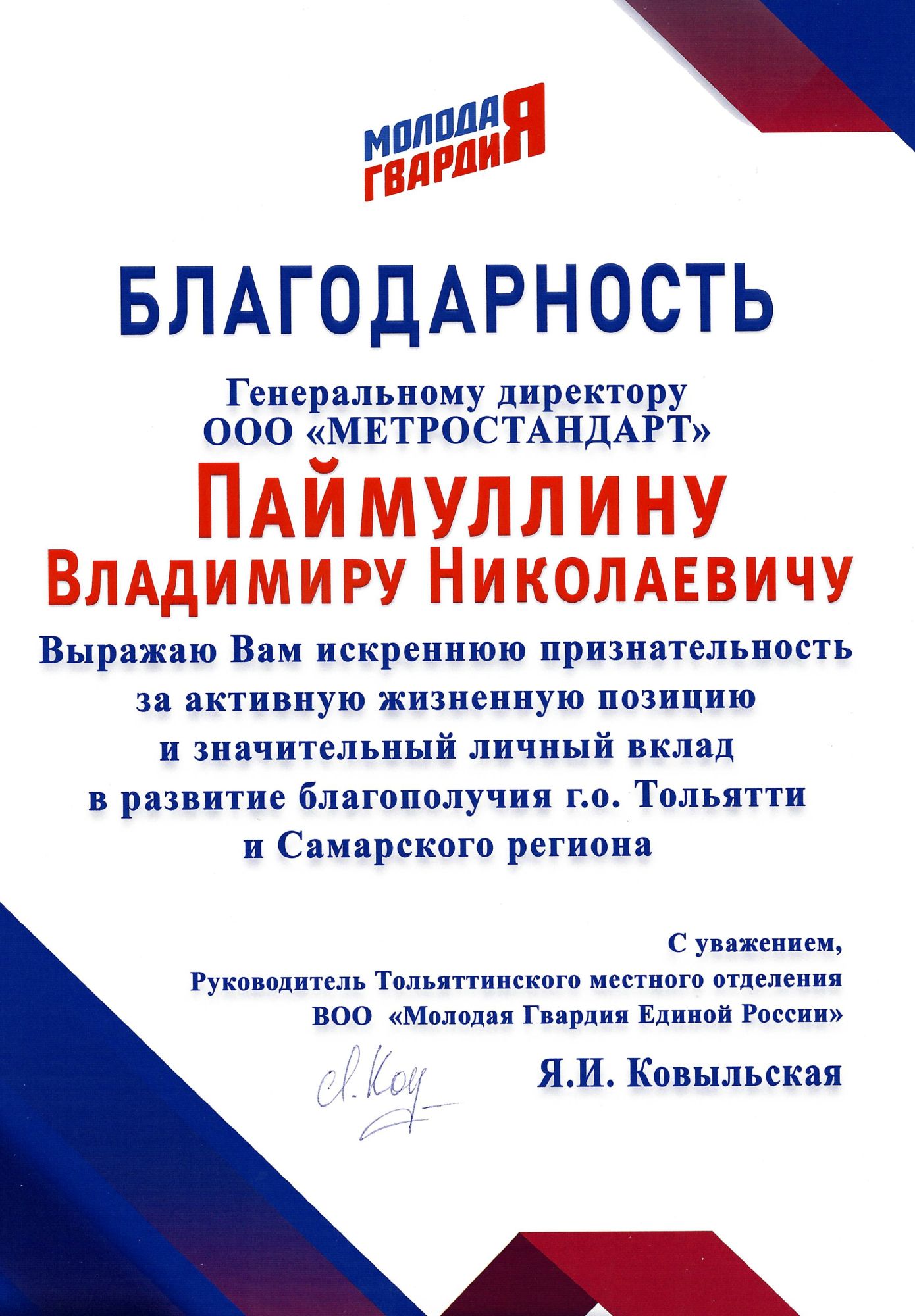 С радостью сообщаем, что Генеральный директор ООО «МетроСтандарт» Владимир Николаевич Паймуллин получил искреннюю благодарность от Яны Игоревны Ковыльской, руководителя Тольяттинского местного отделения ВОО «Молодая Гвардия Единой России». В своем послании она отметила его активную жизненную позицию и значительный вклад в развитие благополучия города Тольятти и всего Самарского региона. Мы гордимся тем, что наши усилия и работа по улучшению экономики и жизни людей находятся на хорошем счету. Спасибо, Владимир Николаевич, за вашу преданность делу!