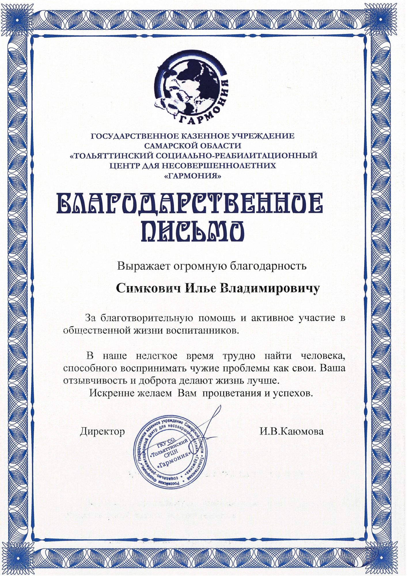 Компания "МетроСтандарт" с гордостью сообщает, что наш коллега Илья Владимирович Симкович получил благодарственное письмо от Тольяттинского социально-реабилитационного центра для несовершеннолетних "Гармония".